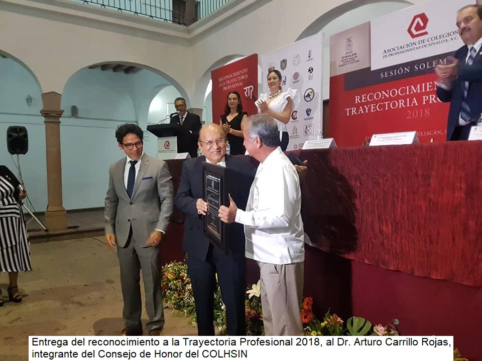 La Asociación de Colegios de Profesionistas de Sinaloa entrega Reconocimiento a la Trayectoria Profesional 2018, al Dr. Arturo Carrillo Rojas, integrante del Consejo de Honor del COLHSIN.